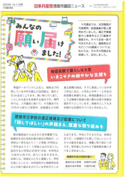 帝国データバンクによると、現時点で判明している今年の値上げ品目数は、累計2万34品目に上ります。買い物に行く度に、くらしの大変さを実感する毎日です。鳴門市では、3月議会に続いて、9月議会でも10月から新たに保育所、幼稚園などの給食主食費の助成、すでに実施している中学3年生に加え、小学生と中学1~2年生の給食費も無償化する。新規就農者などに対しては機械や設備の導入費の支援や漁業支援を行うとしています。徳島市としてもきめ細かな支援を行うべきと求めました。