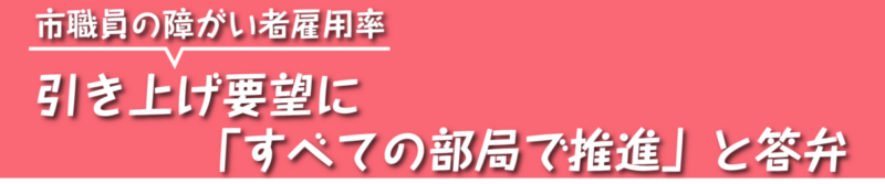 現在の障がい者雇用率は、市長部局(法定雇用率2.8%に対して)2.82%、教育委員会(法定雇用率2.7%に対して)2.11%、病院局(法定雇用率2.8%に対して)2.76%、上下水道局(法定雇用率2.8%に対して)1.39%です。