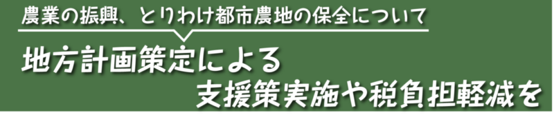 ①都市農業振興基本法による地方計画を策定し、市街化区域農業の支援施策を実施すること。
