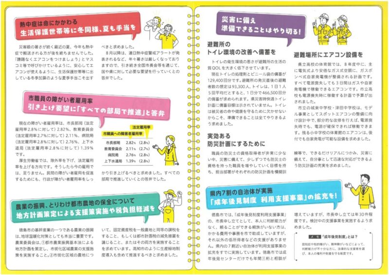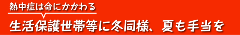 災害級の暑さが続く最近の夏、今年も熱中症で搬送される方が後を絶ちませんでした。「躊躇なくエアコンをつけましょう」とマスコミ等で呼びかけているように、安心してエアコンが使えるように、生活保護世帯等に出している冬季加算のような夏季手当こそ出すべきと求めました。 8月以降は、連巳熱中症警戒アラートが発表されるなど、年々暑さは厳しくなっておりますので、引き続き全国市長会等を通じて、国や県に対して必要な要望を行っていくとの答弁でした。